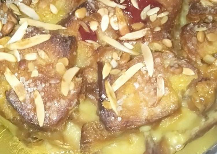 - Then assemble the bread in cake tin and pour the custard milk,then add crumbly biscuits,and mix nuts,now registered custard pie,.